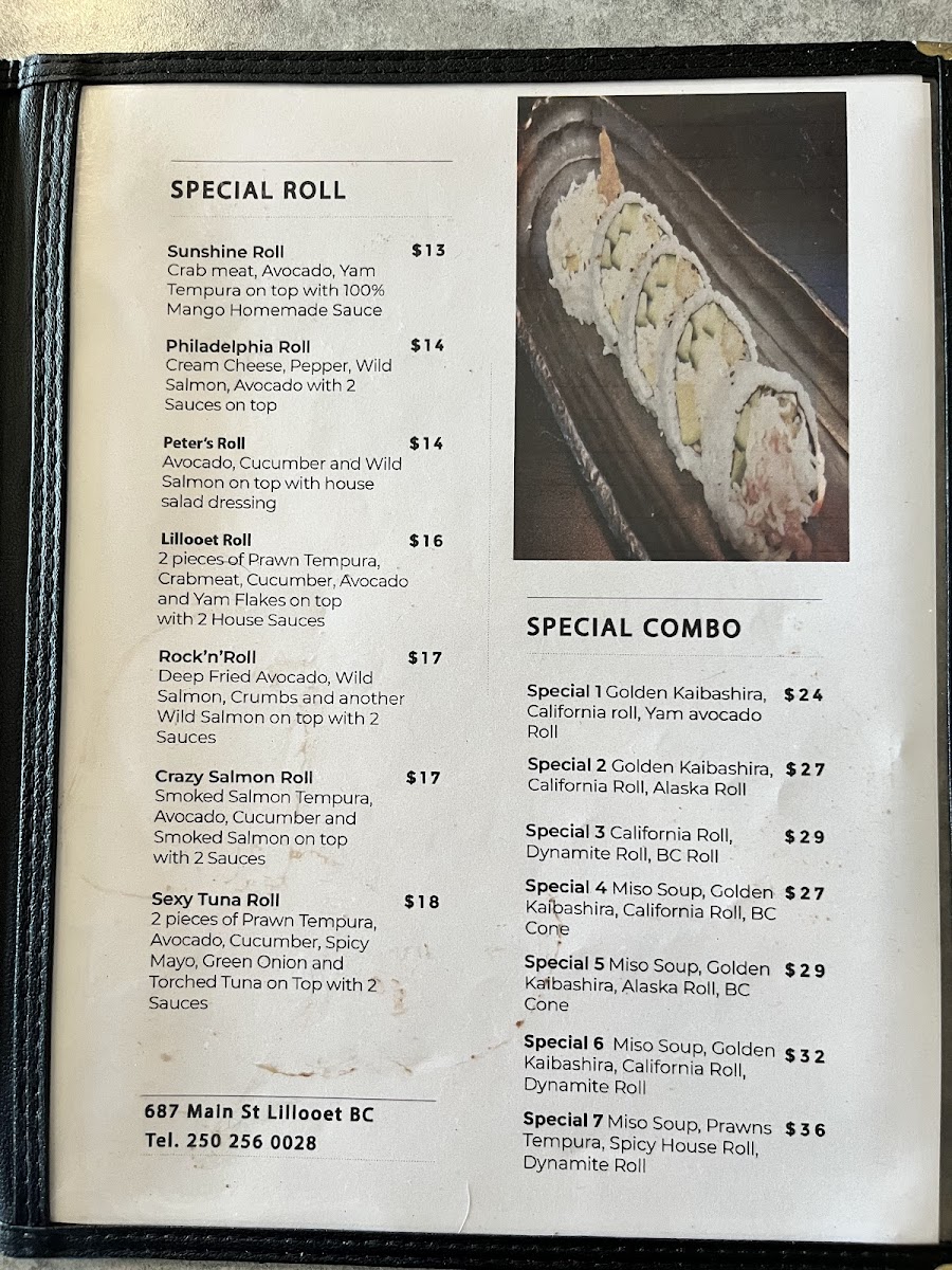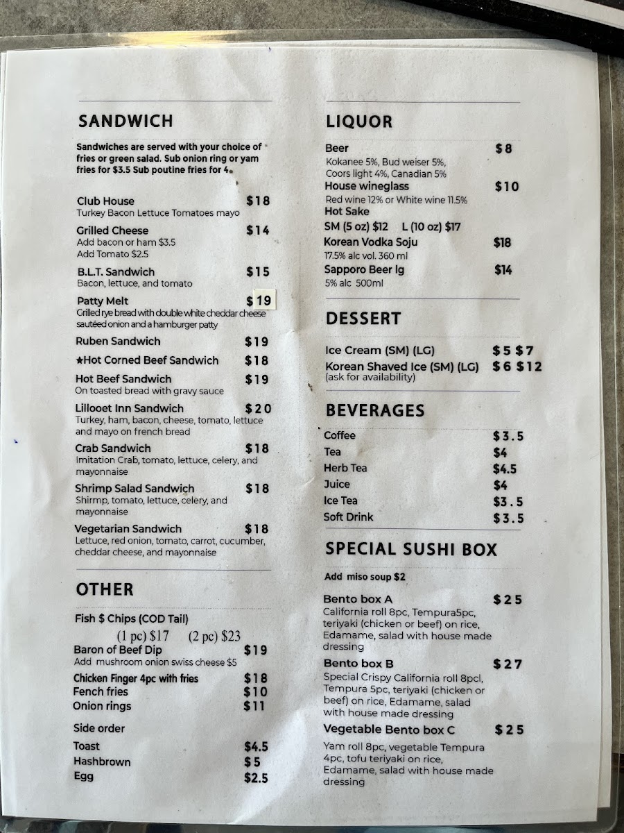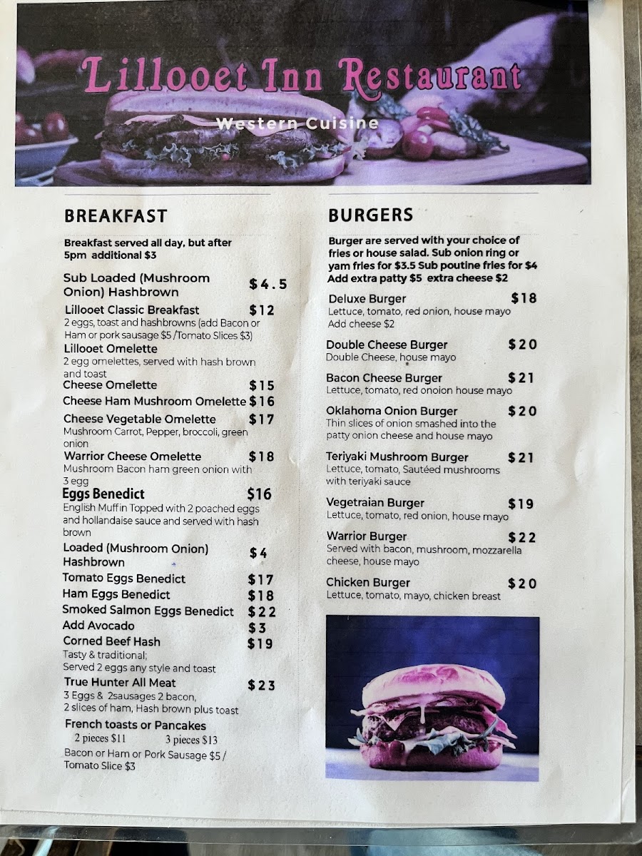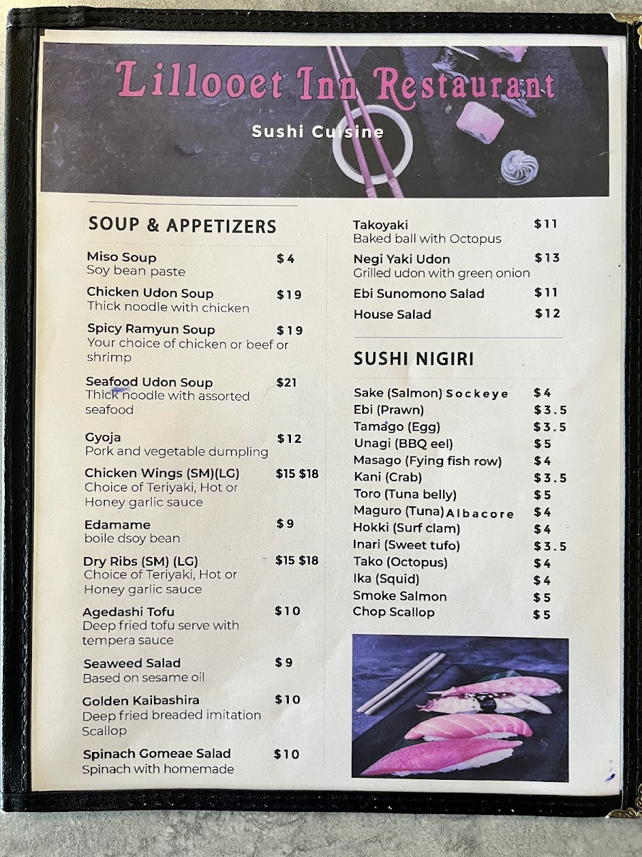 The menu at Lillooet Inn Restaurant offers a blend of comforting café-style options alongside thoughtfully prepared Japanese and Western dishes. It’s the kind of place where you can enjoy casual bites whether you're dropping in for a morning breakfast or settling down for a laid-back dinner.